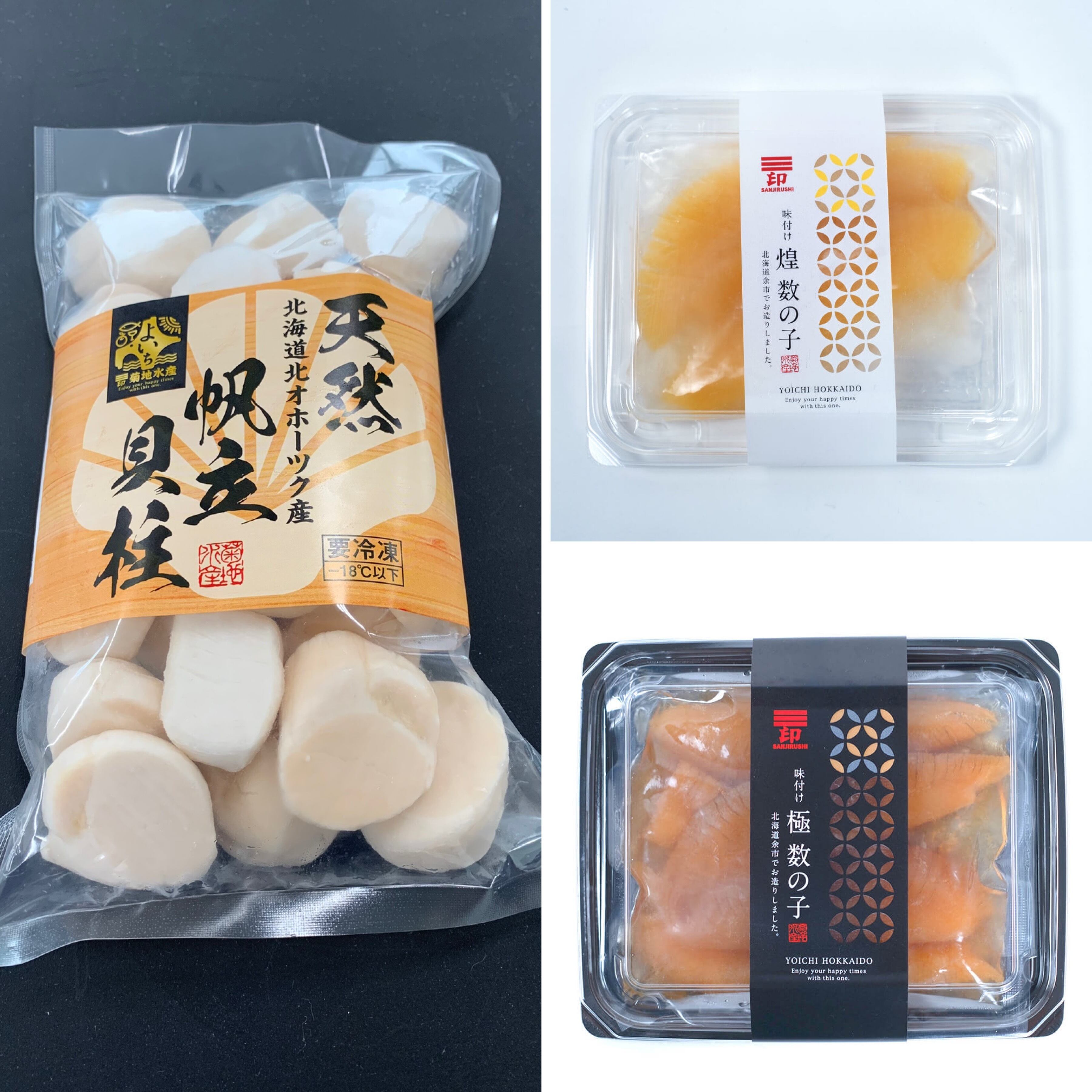 なんと、北海道産の冷凍ホタテ500g、味付け数の子白醤油100g、味付け数の子黒醤油100gがセットに。
